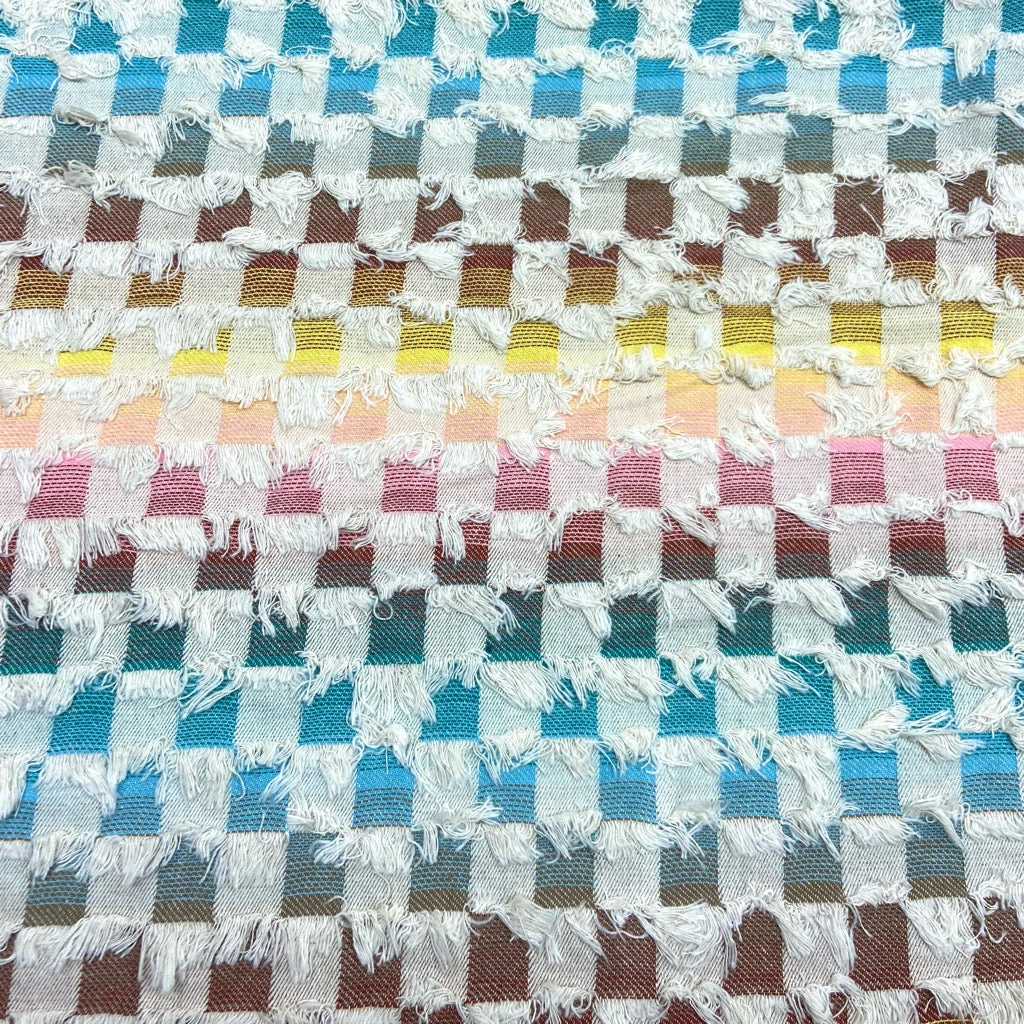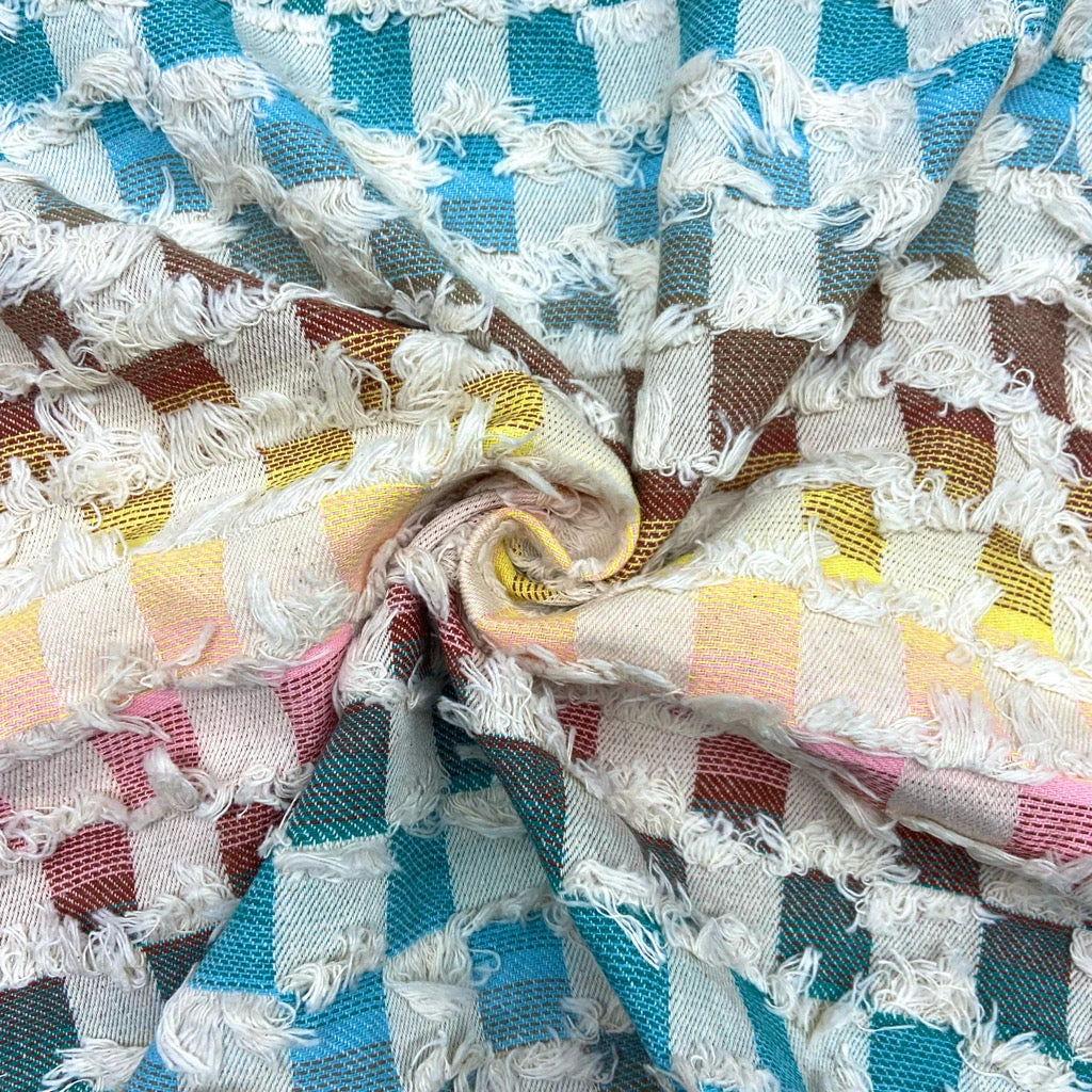 This medium-weight denim fabric features a multicoloured checkered design with distressed tassels, adding a unique touch to the fabric.Â