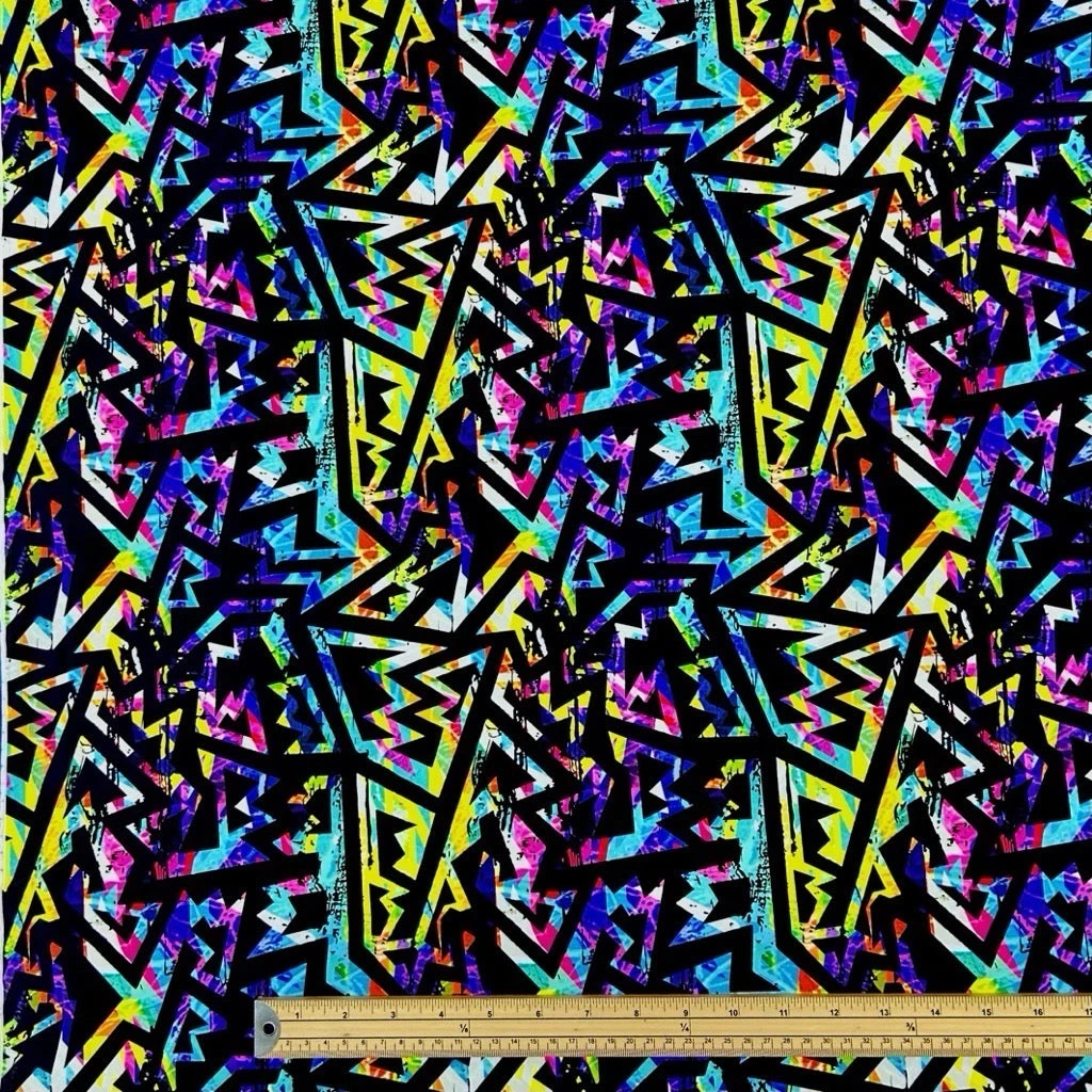 A digitally printed, medium weight jersey fabric featuring a multicoloured, abstract design. This fabric is durable and stretchy, making it perfect for yoga/gym leggings, dance wear and workout clothing.