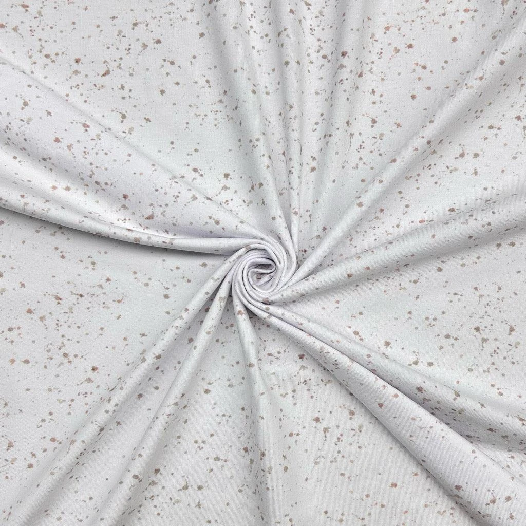 A high quality cotton lycra fabric featuring a beige paint splatters design on a white background. This fabric would be great for a range of dressmaking projects such as tops, dresses, skirts, pyjamas and more.Â