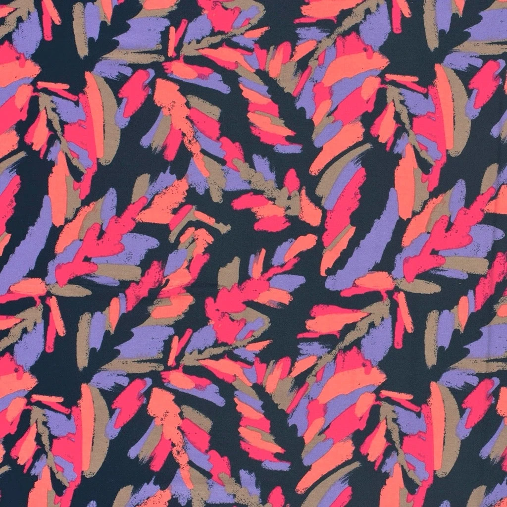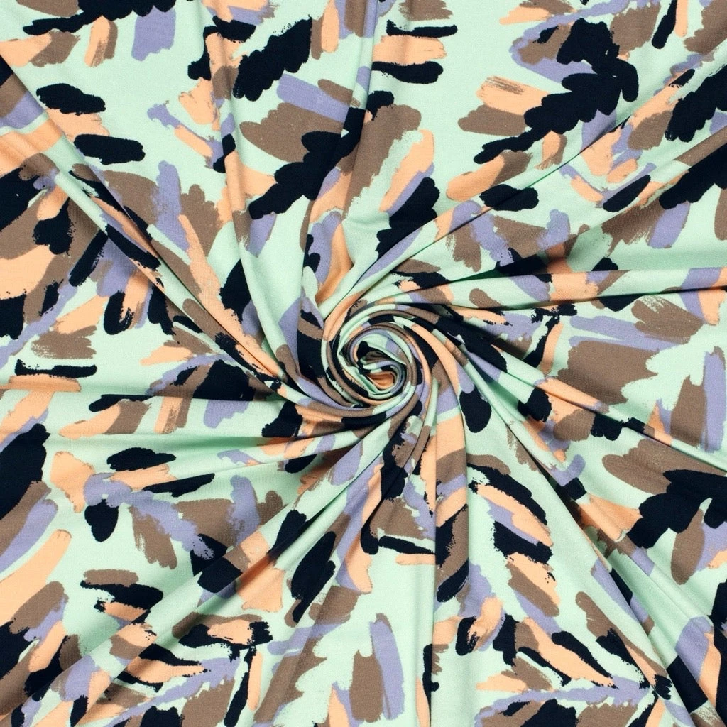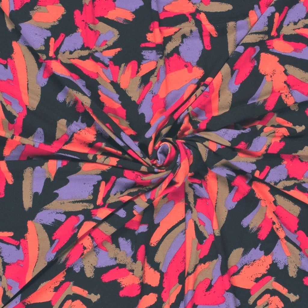 A lightweight viscose jersey fabric featuring an abstract design. This lightweight and breathable fabric features a gorgeous drape. Suitable for pyjamas, tops, leggings and many more dressmaking projects. Available in 3 colours.