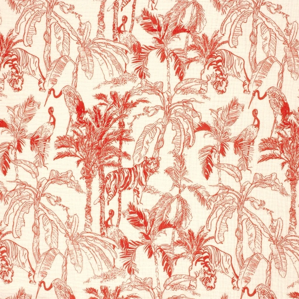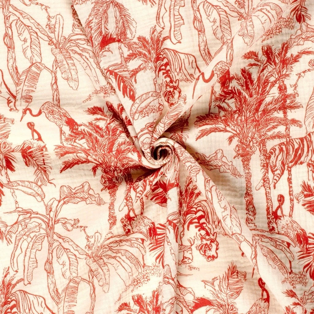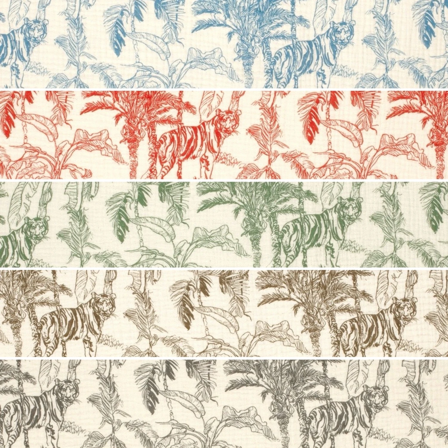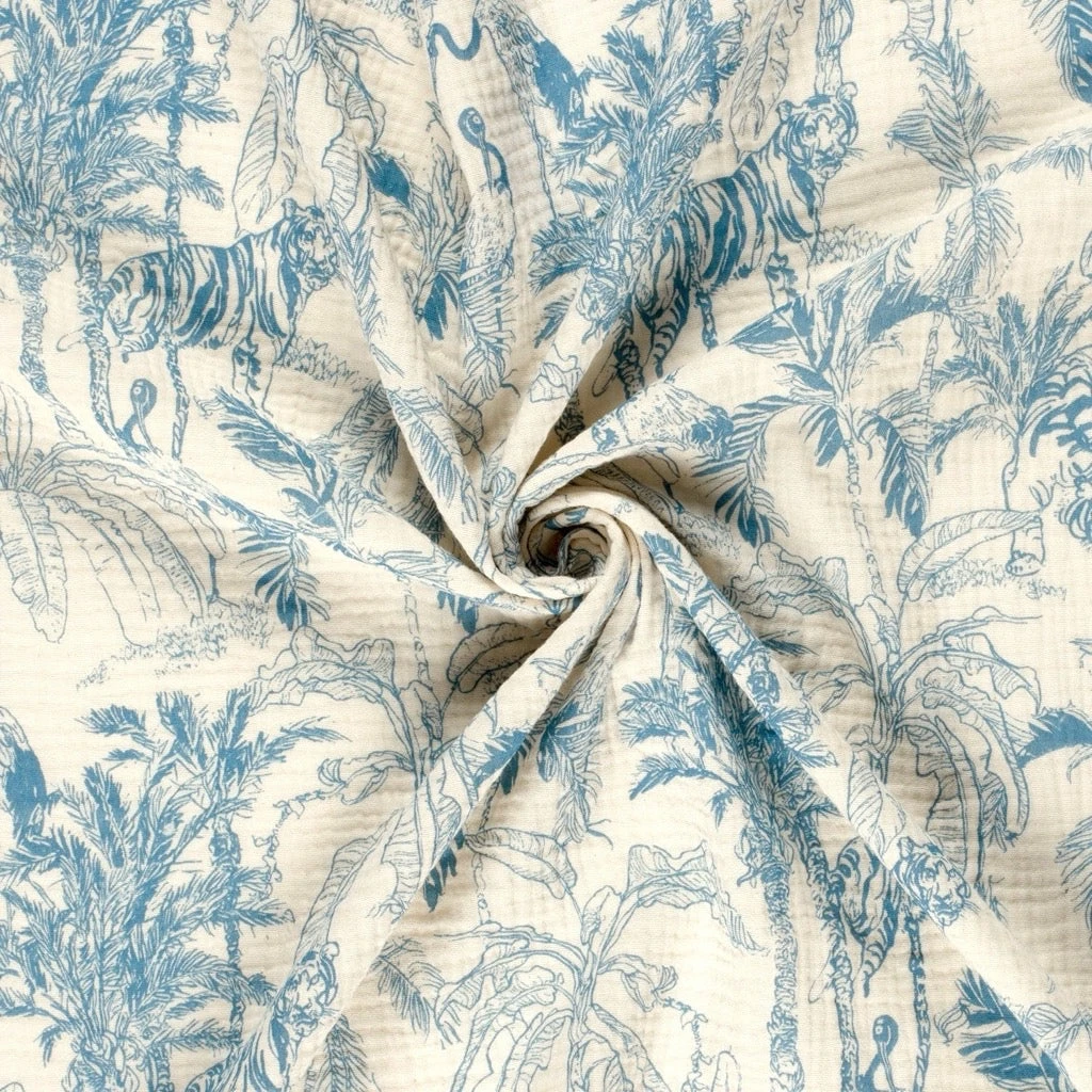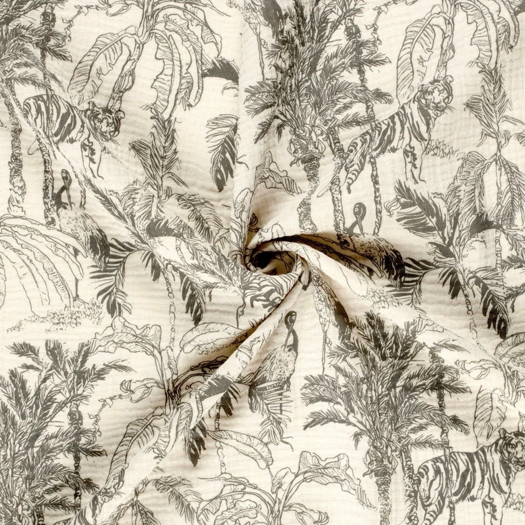 A high quality double gauze fabric featuring a jungle wildlife print. Double gauze is a breathable and soft fabric, which is made from two layers of muslin. They are attached together with tiny stab stitches in a grid pattern at regular intervals, however this is barely visible. It has a natural crinkle texture that gives it a lovely look.