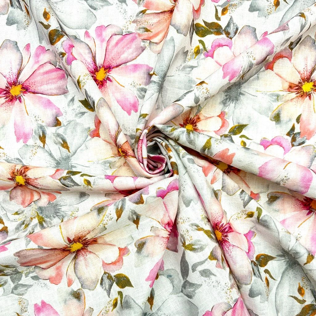 A linen and cotton blend fabric featuring a stunning digitally printed design. This fabric drapes well (not as much as our linen viscose) and doesn’t crease easily, it is easy to handle and would be ideal for dresses, tops, skirts, comfortable trousers and other summer clothing.