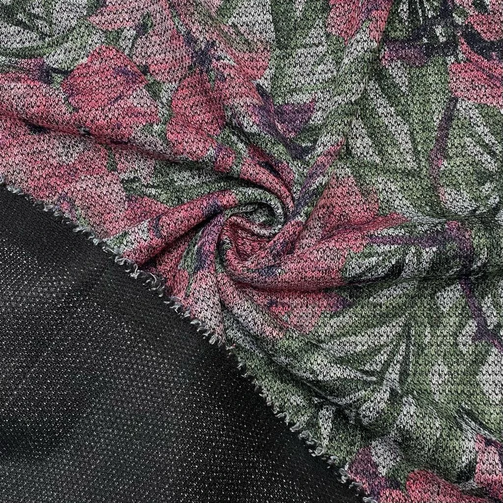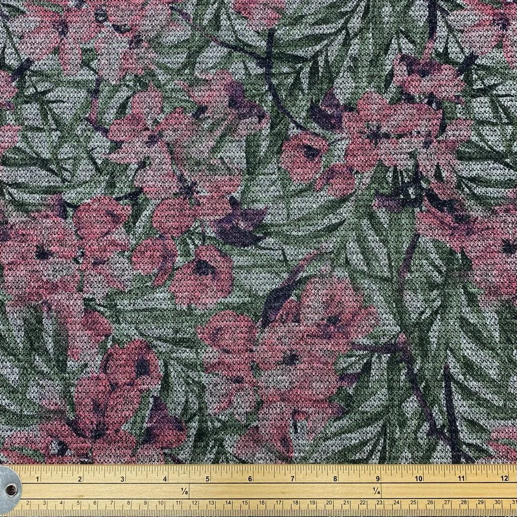 This jersey fabric features a pink floral print with lurex running through the fabric adding sparkle. This would be suitable for a range of dress making projects such as tops, dresses, accessories and more! Available in 2 colours.