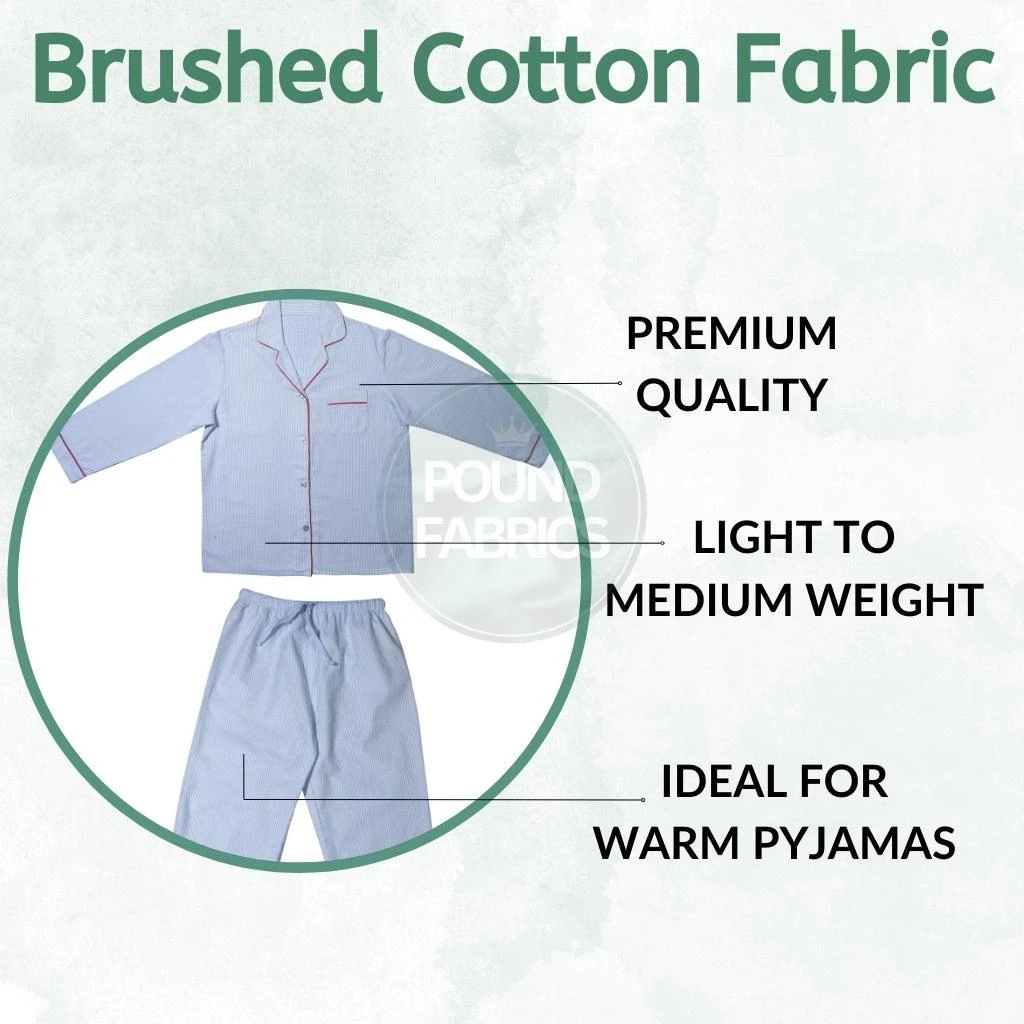 A plain soft brushed cotton fabric (also known as flannel, flannelette or winceyette fabric) available in a small range of colours. This fabric is light to medium weight and would be ideal for warm pyjamas but can be used for lightweight shirt, trousers & more.
