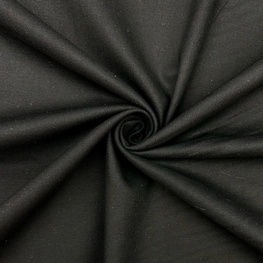A plain, medium-weight cotton twill fabric, featuring a slight stretch across the width. This fabric is a versatile and durable material that has the softness and breathability of cotton paired with a comfortable stretch.Â
