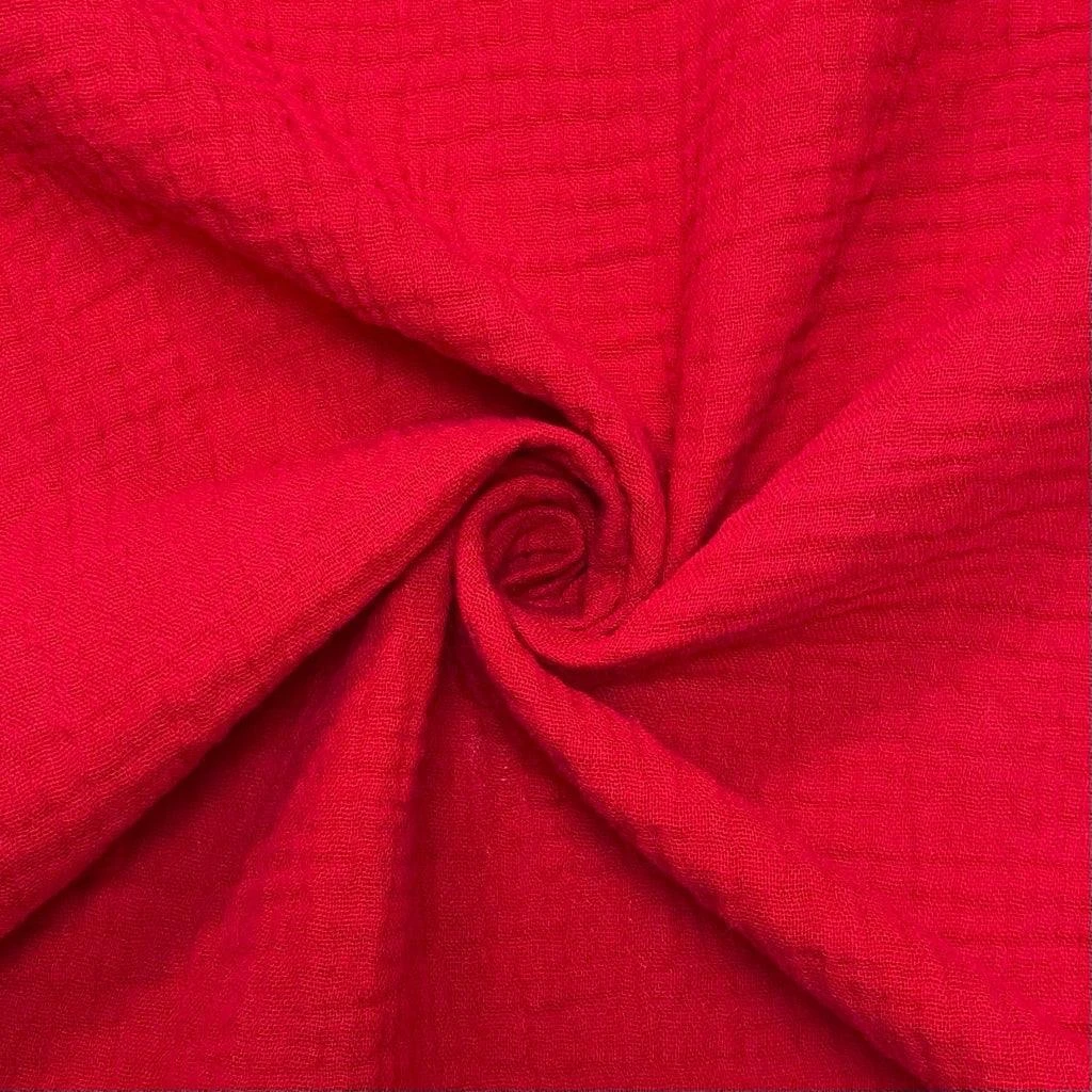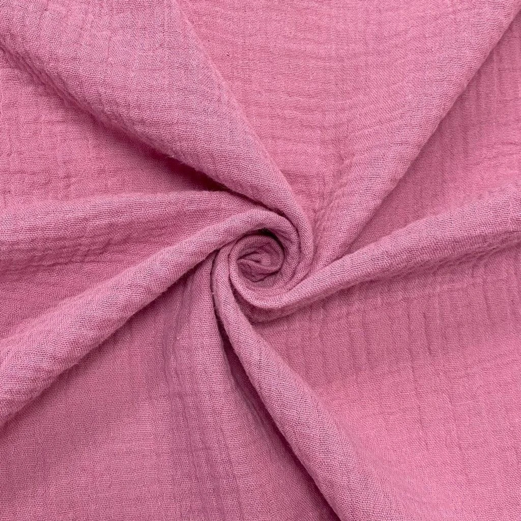 Plain double gauze fabric available in 24 colours. Double gauze is a breathable and soft fabric, which is made from two layers of fine open woven cotton (muslin). They are attached together with tiny stab stitches in a grid pattern at regular intervals, however this is barely visible.Â