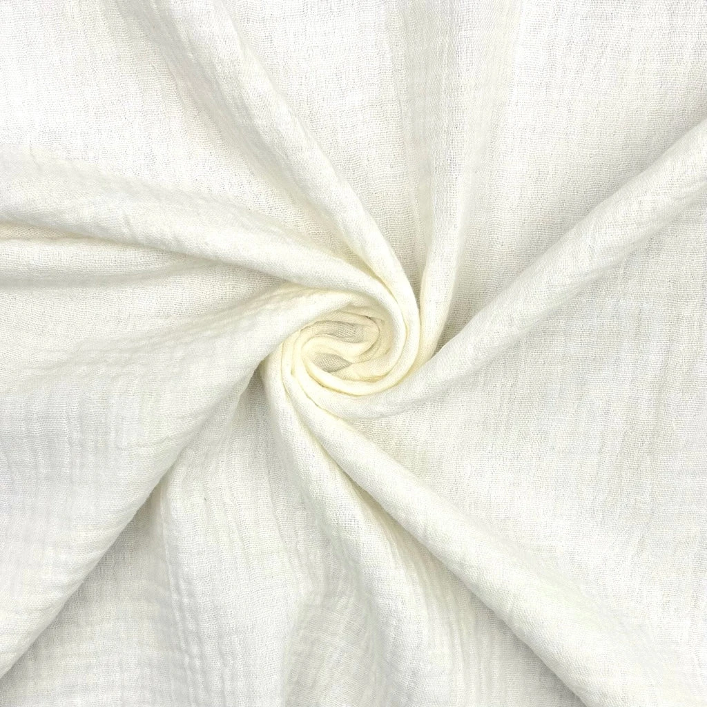 A plain double gauze fabric in an ivory colour. Double gauze is a breathable and soft fabric, which is made from two layers of fine open woven cotton (muslin). They are attached together with tiny stab stitches in a grid pattern at regular intervals, however this is barely visible.Â