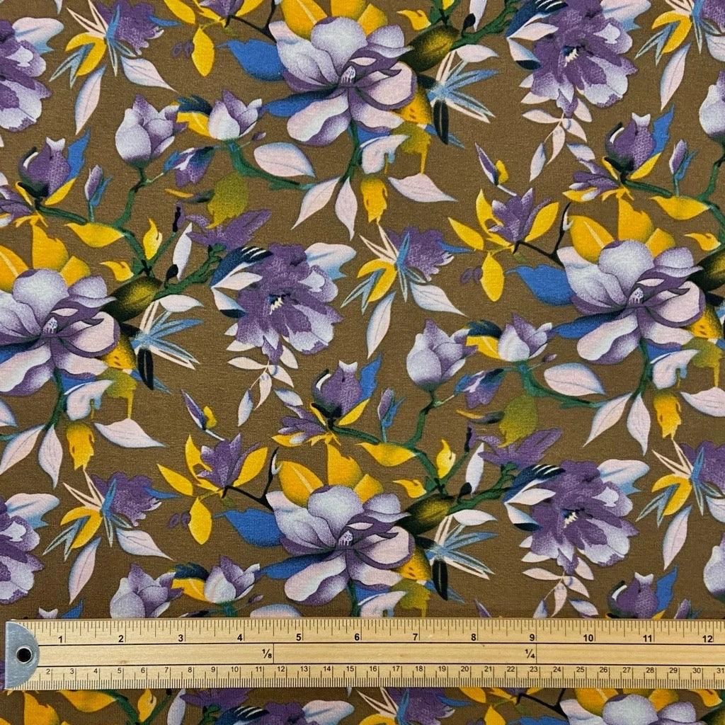 A high quality viscose jersey fabric featuring a floral print in purple and yellow on a brown background. It is soft to touch and stretchy. This fabric is light to medium weight and is suitable for pyjamas, tops, leggings and many more dressmaking projects.