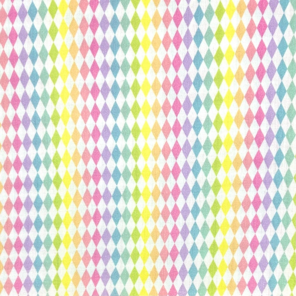 A stunning, Little Johnny branded double gauze fabric featuring a multicoloured diamond print. Double gauze is a breathable and soft fabric, which is made from two layers of muslin. They are attached together with tiny stab stitches in a grid pattern at regular intervals, however this is barely visible.Â