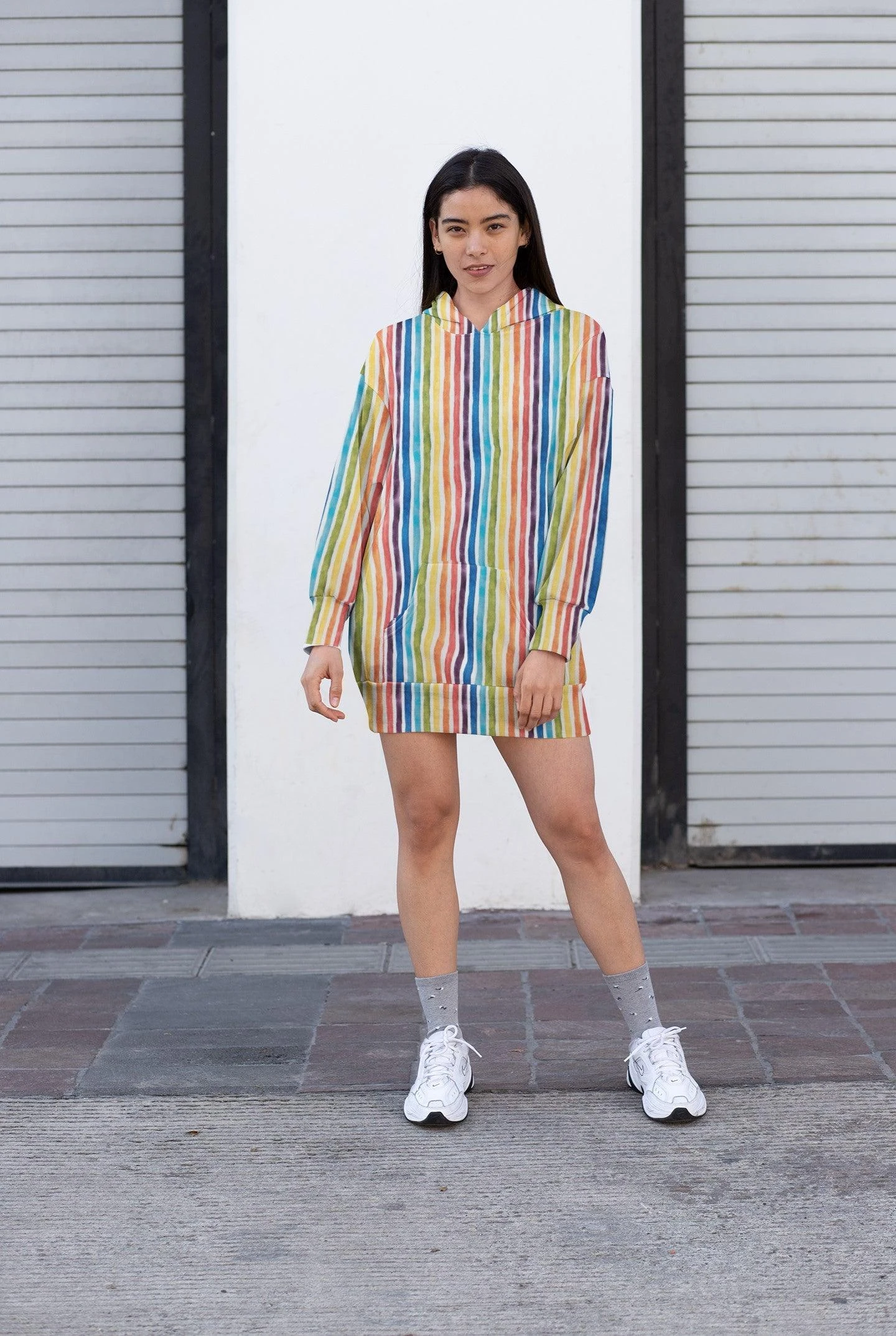 A Digital French Terry fabric featuring a stripe print. French Terry, also known as loop back jersey has small loops/piles of yarn on the reverse side, giving it extra comfort and warmth. This fabric has 4 way stretch and would be suitable for sweatshirts, hoodies, pyjamas, tops, leggings and more!