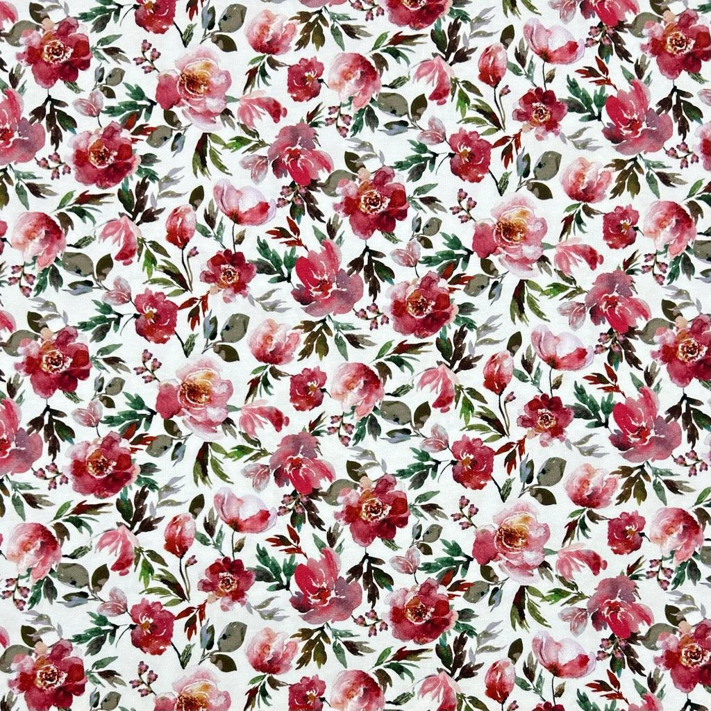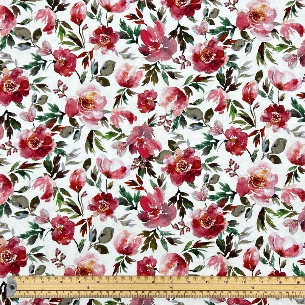 A high quality cotton jersey fabric also known as cotton lycra, featuring a flowers and leaves design on an ivory background. This fabric is soft to touch and has 4 way stretch. Suitable for tops, leggings, dresses and more!