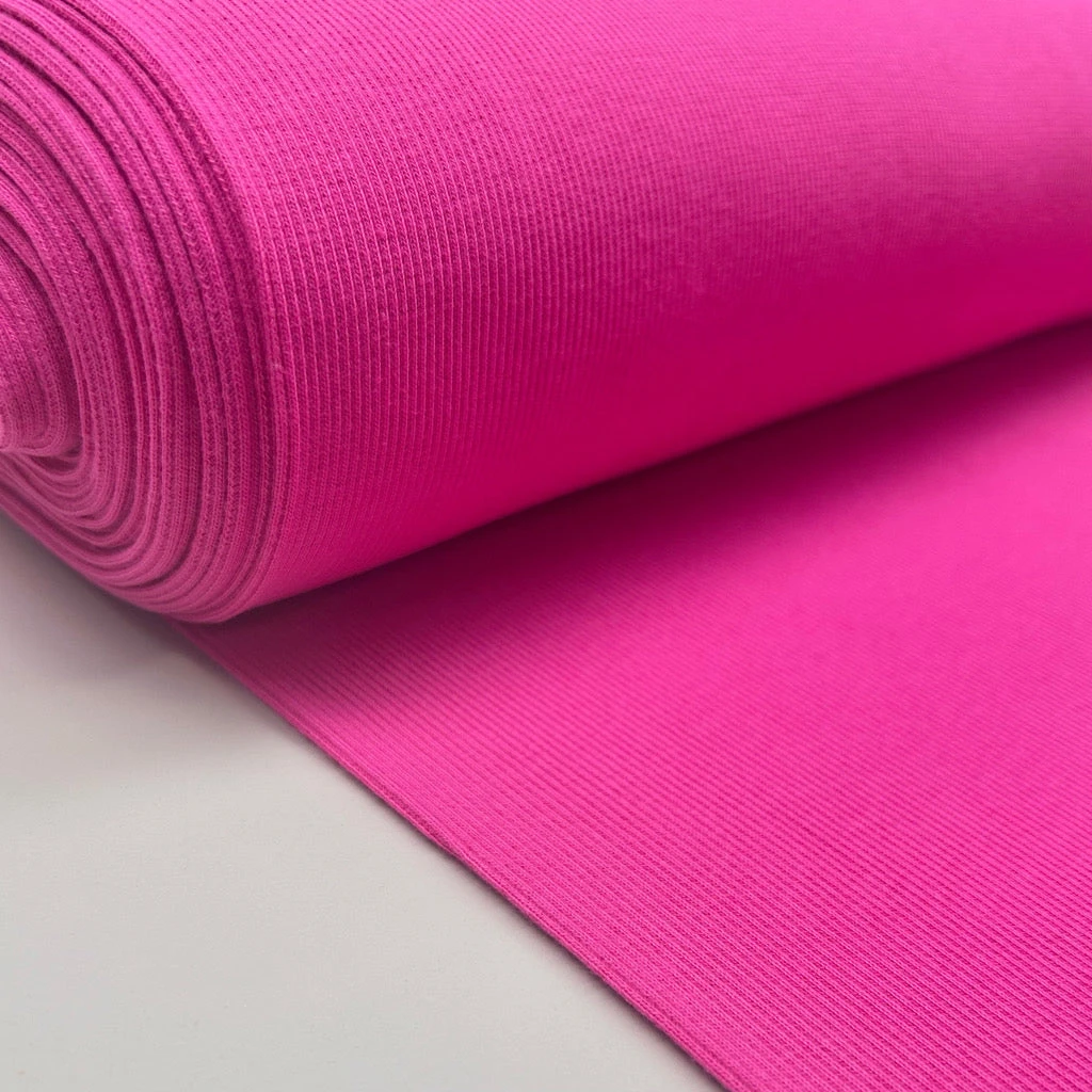 A high quality, tubular ribbing fabric made of cotton and elastane. This fabric is soft, breathable, and has a four way stretch with minimal stretch across the length. Perfect for cuffs, wristbands, headbands, t-shirts, and more!Â
