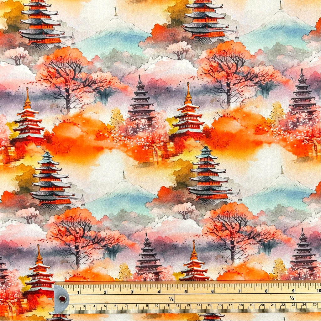 A Rose & Hubble printed cotton poplin fabric featuring a landscape pattern. This fabric would be suitable for a range of dressmaking projects such as tops, dresses, and skirts, as well as quilting and crafting projects!
