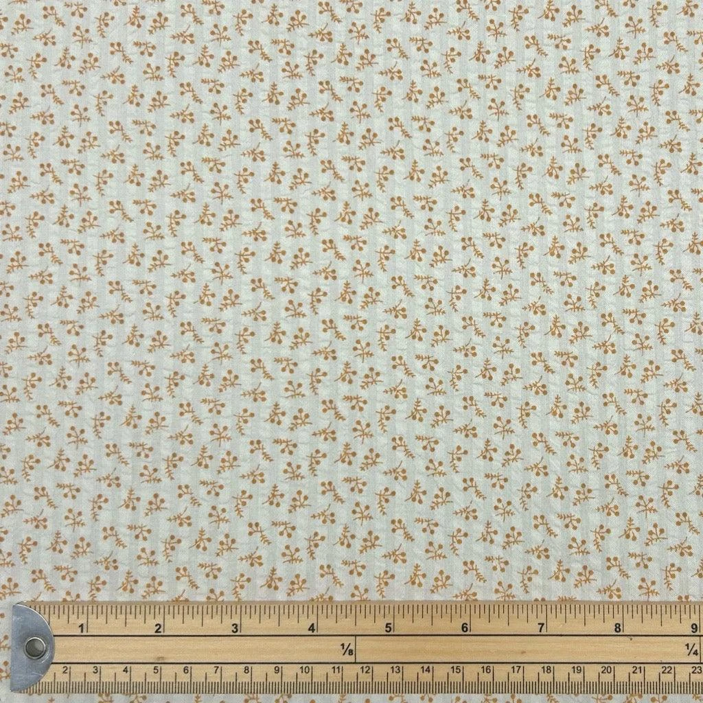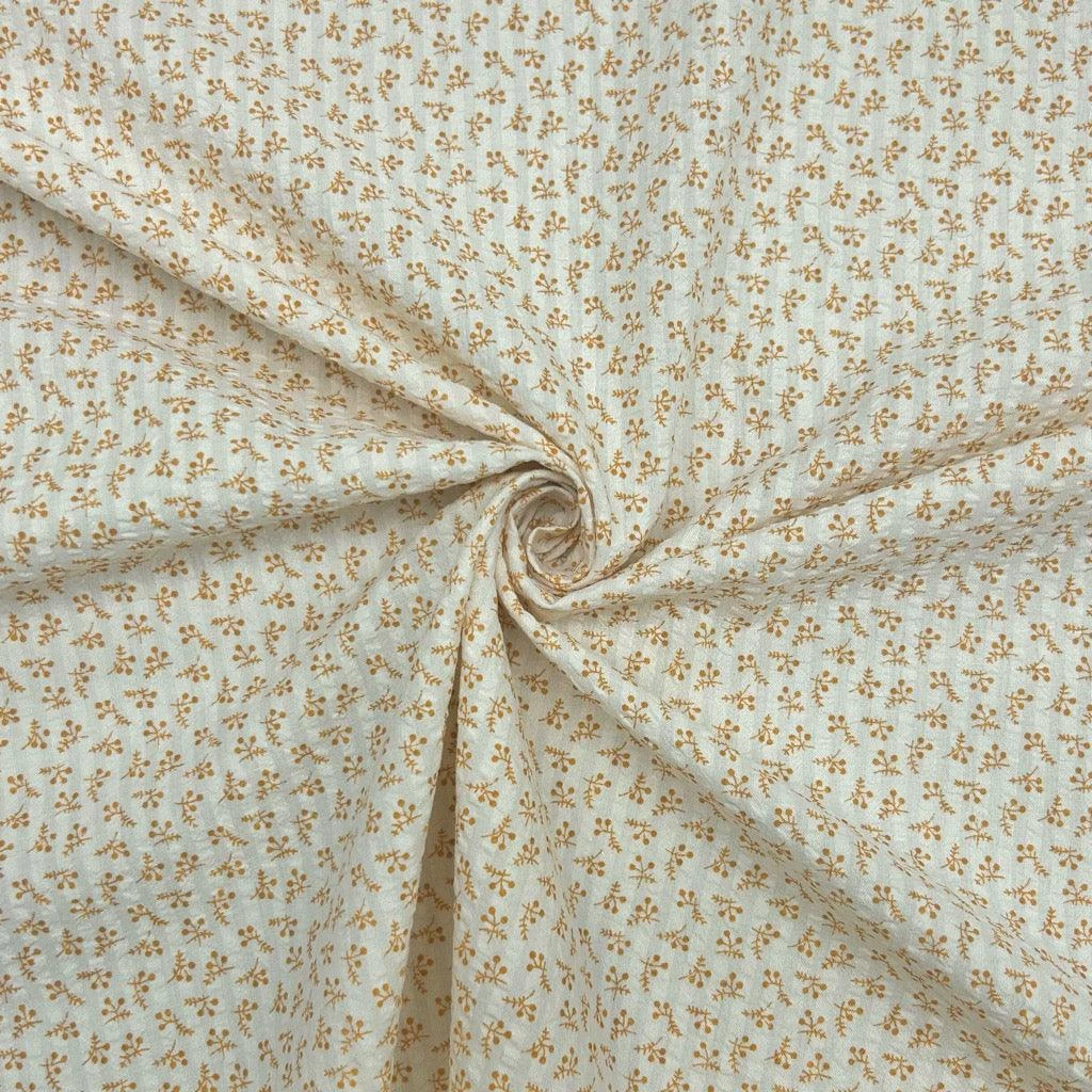 Seersucker fabric has a puckered surface which is created by weaving groups of threads together to create a crinkle or puckered effect. This lightweight and breathable fabric features a small flowers design on a light cream background. It would be a great choice for tops, skirts, trousers, dresses, accessories and more! Available in 4 colours.