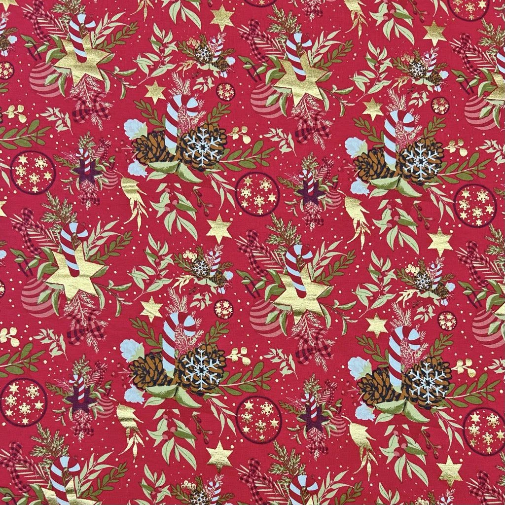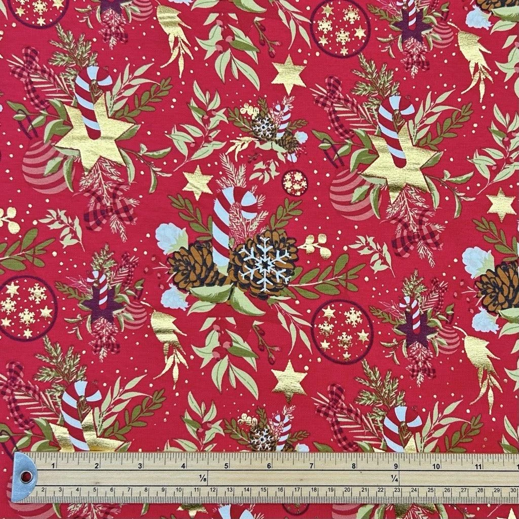 A high quality cotton jersey fabric also known as cotton lycra, featuring a Christmas themed print with gold foil. This fabric is soft to touch and has 4 way stretch. Suitable for tops, leggings, dresses and more! Available in 3 colours.