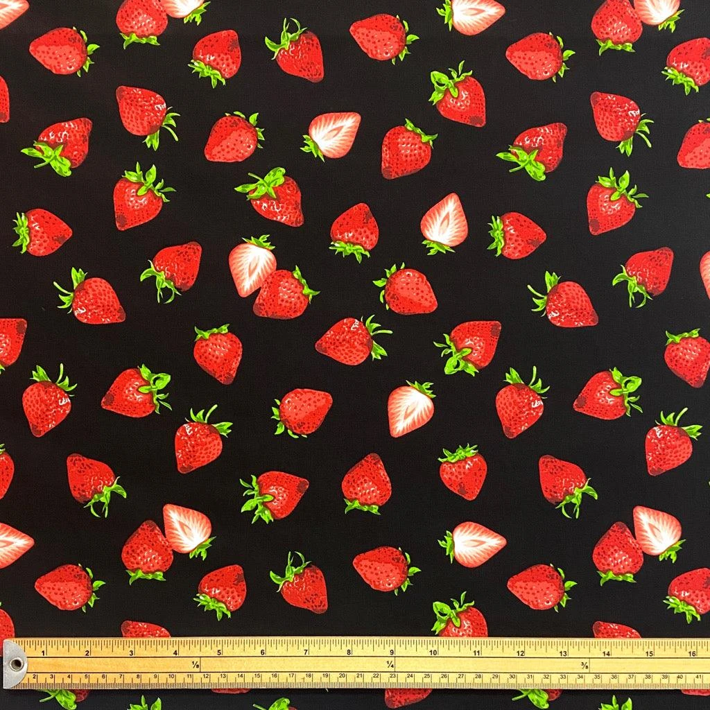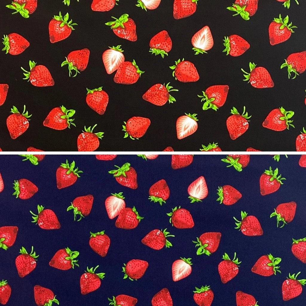 A Rose & Hubble cotton poplin fabric featuring a strawberries design. Suitable for tops, skirts, dresses, accessories and more!