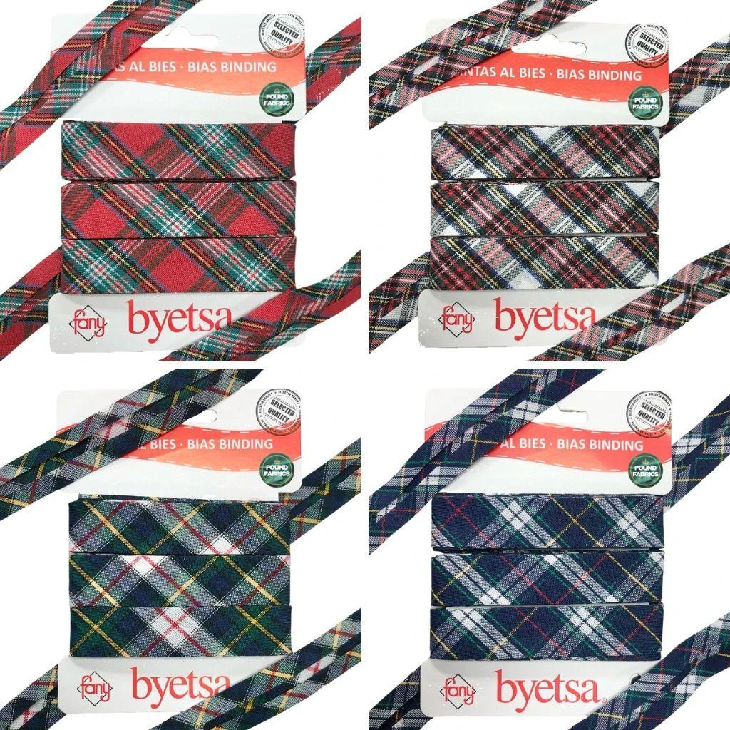 Quality polycotton folded bias binding tape featuring tartan prints.