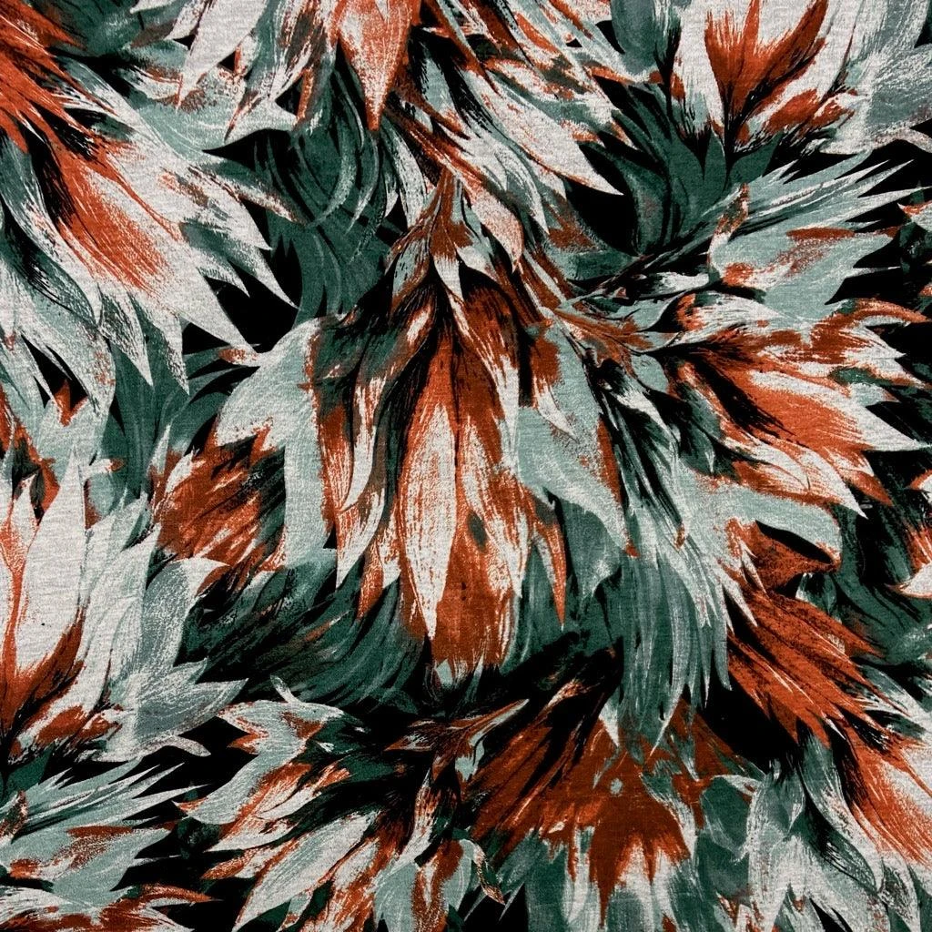 This modal-feel jersey fabric features a gorgeous pattern of leaves. This soft fabric is comfortable to wear and features a lovely stretch across the width. Suitable for a range of dress making projects such as tops, dresses, sweaters and other winter projects.Â
