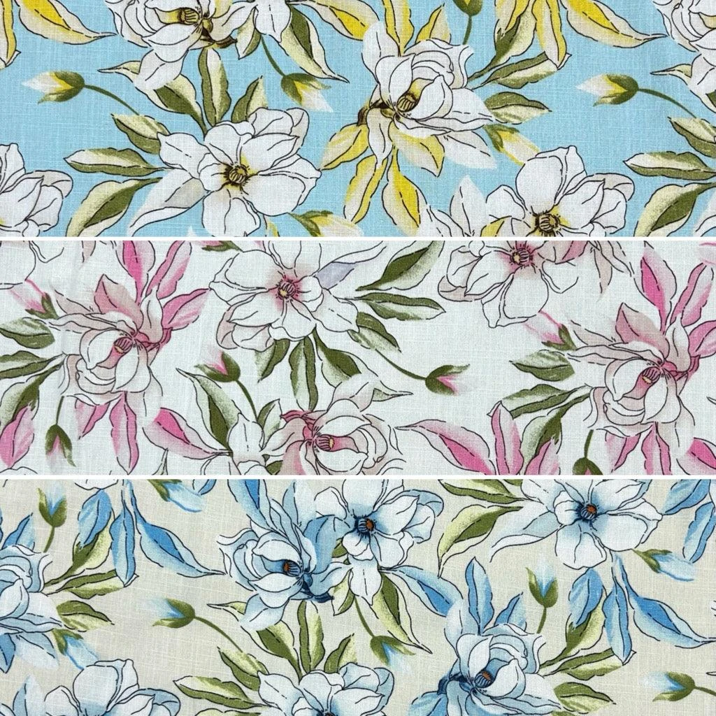 A linen and cotton blend fabric featuring a lovely printed tropical design. This fabric drapes well (not as much as our linen viscose), is easy to handle and would be ideal for dresses, tops, skirts, comfortable trousers and other summer clothing.