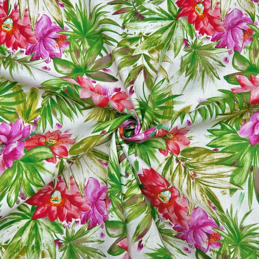 A linen and cotton blend fabric featuring a lovely printed tropical design. This fabric drapes well (not as much as our linen viscose), is easy to handle and would be ideal for dresses, tops, skirts, comfortable trousers and other summer clothing.