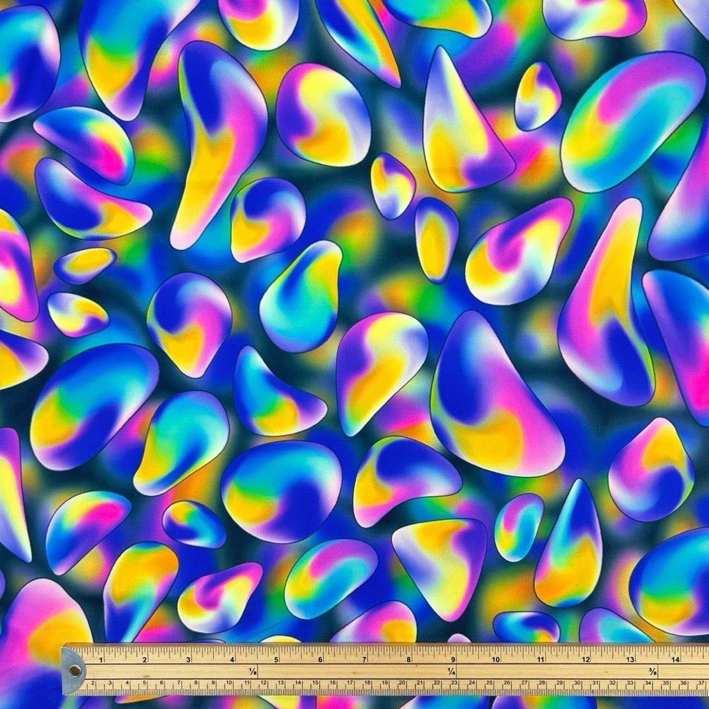 A digitally printed, medium weight jersey fabric featuring a multicoloured, abstract design. This fabric is durable and stretchy, making it perfect for yoga/gym leggings, dance wear and workout clothing.