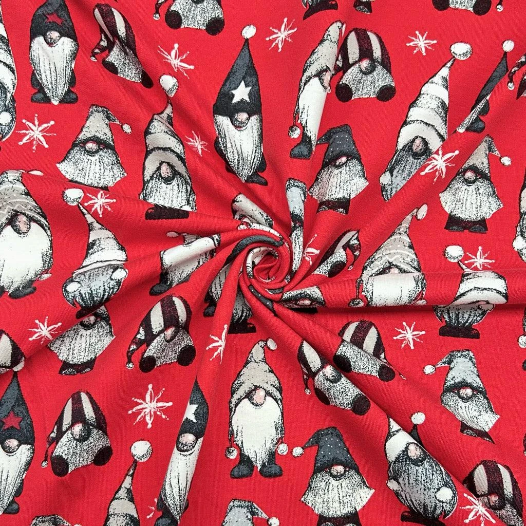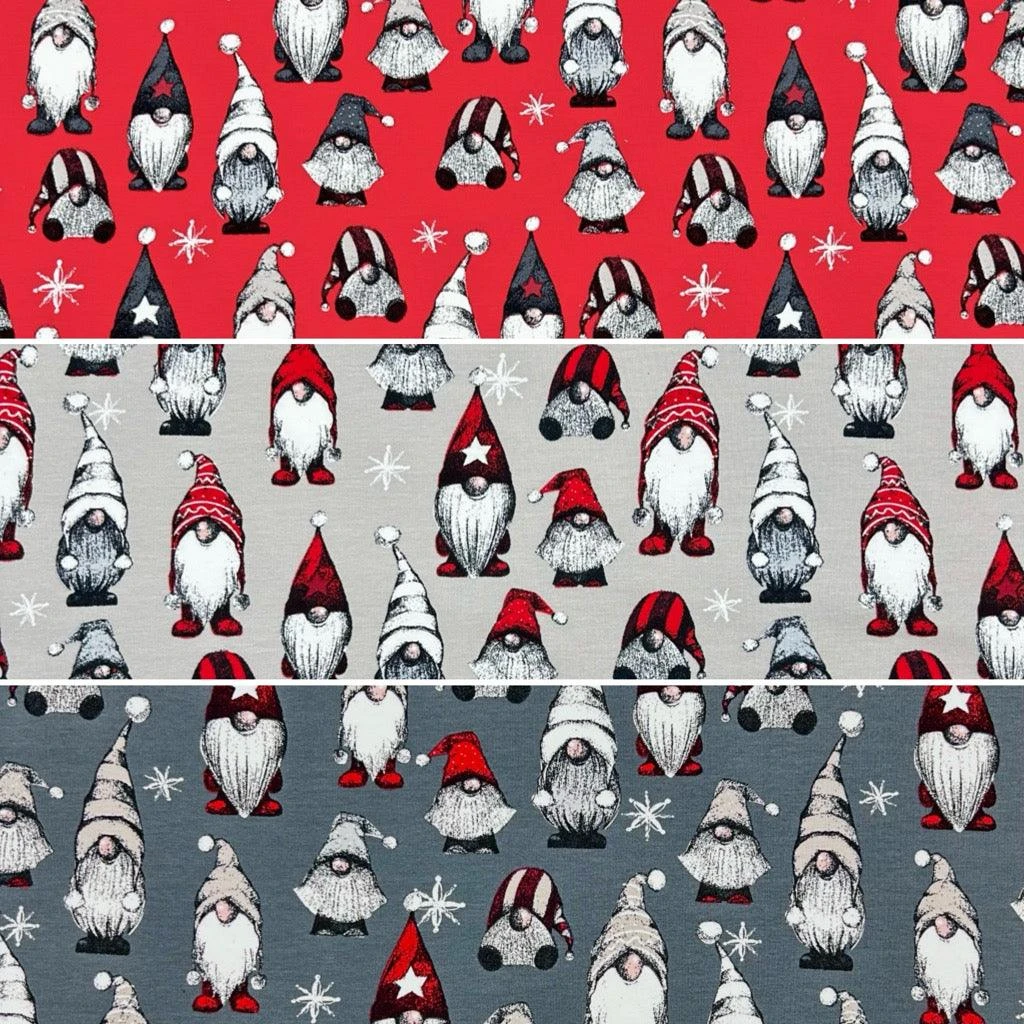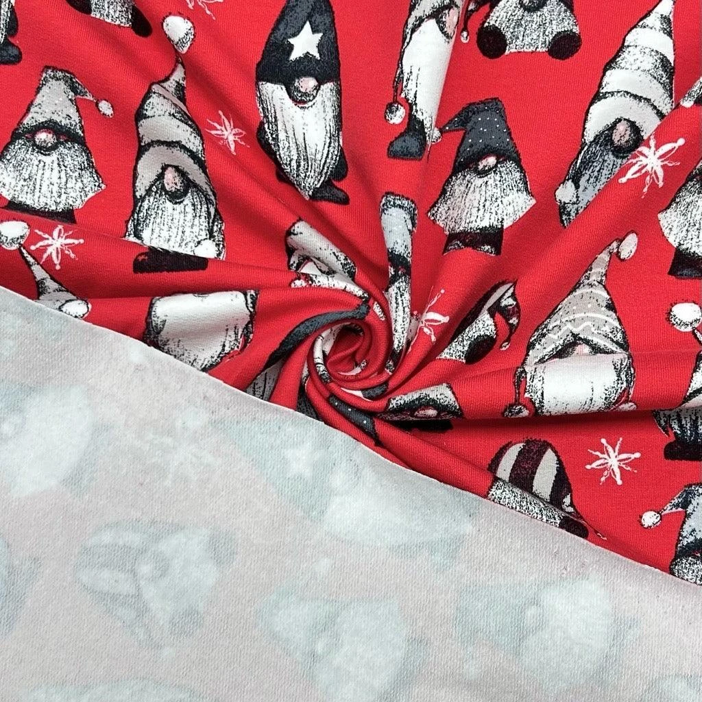 A high-quality brushed french terry fabric featuring a Christmas gnomes design available in 3 colours. This fabric has a soft brushed reverse side and is great for making tops, hoodies, sweatshirts and more!Â