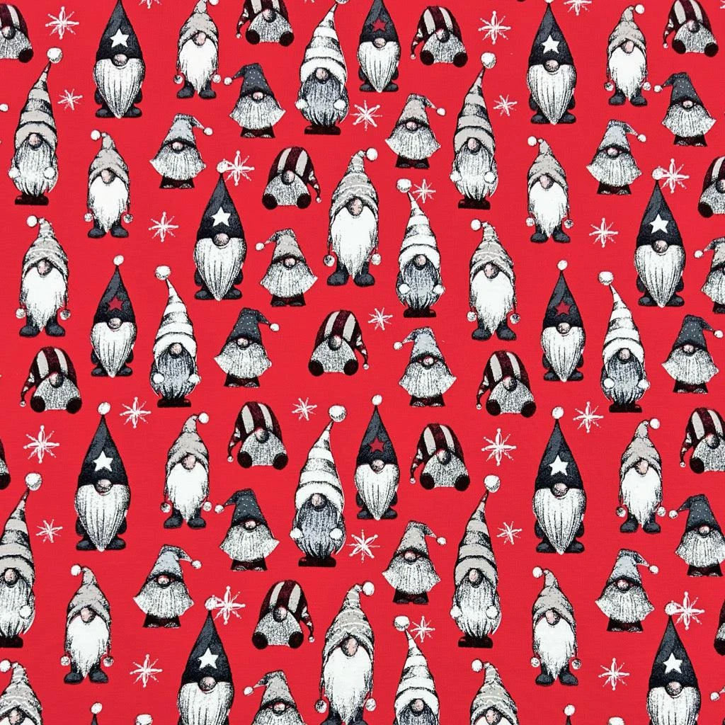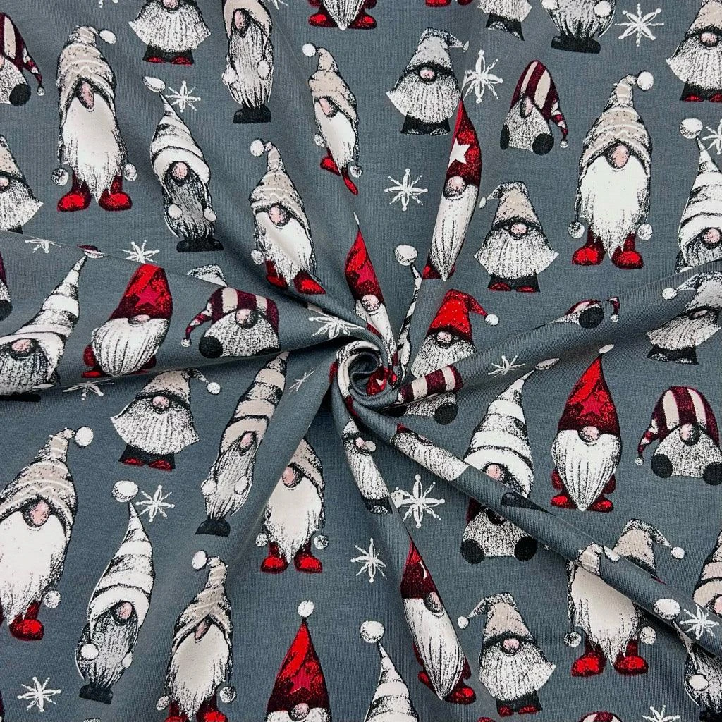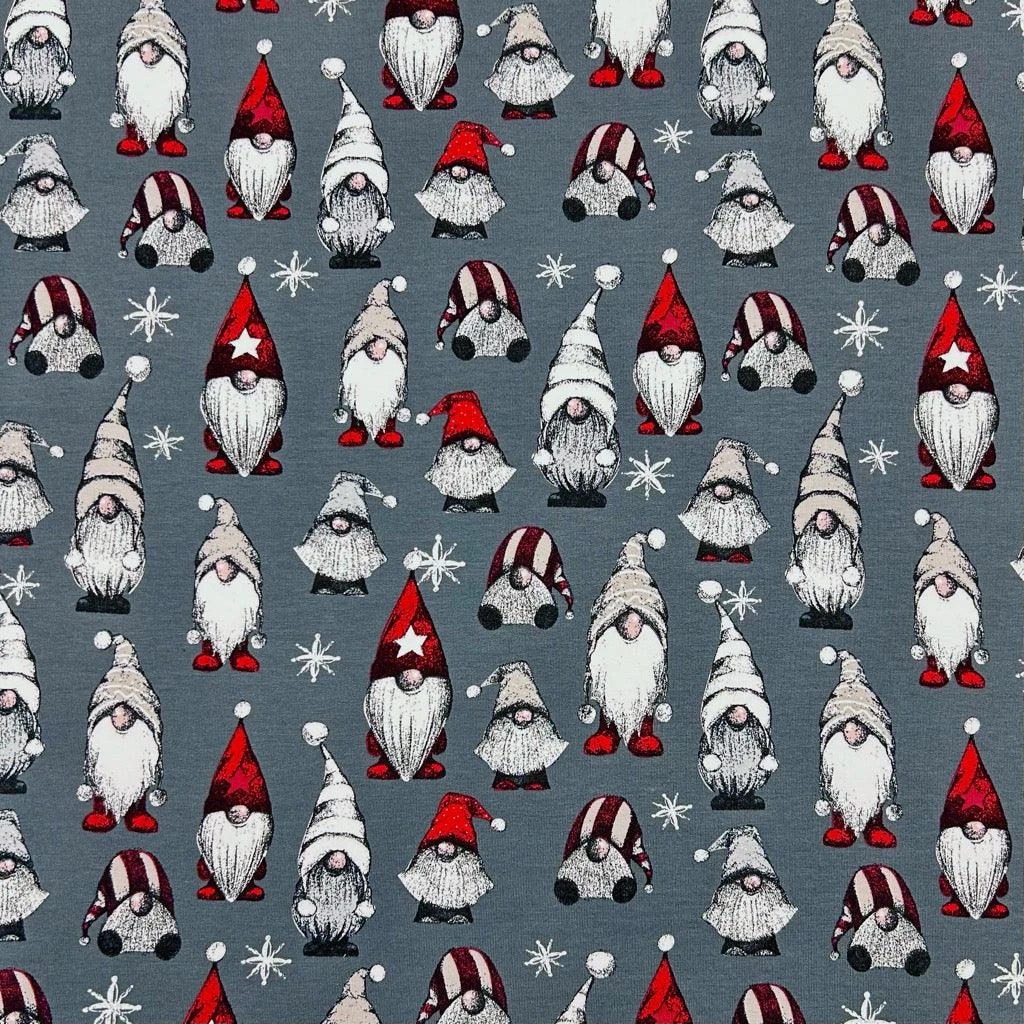 A high-quality brushed french terry fabric featuring a Christmas gnomes design available in 3 colours. This fabric has a soft brushed reverse side and is great for making tops, hoodies, sweatshirts and more!Â