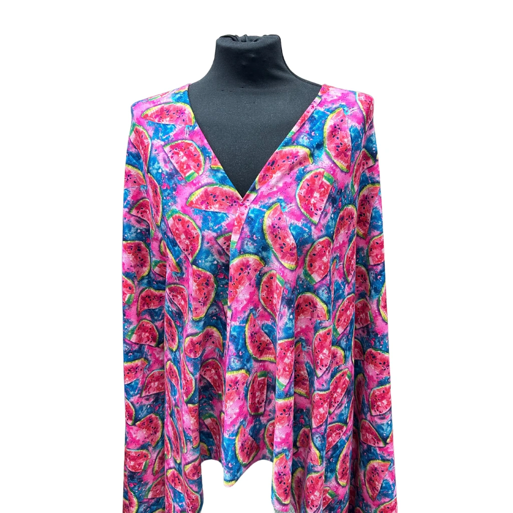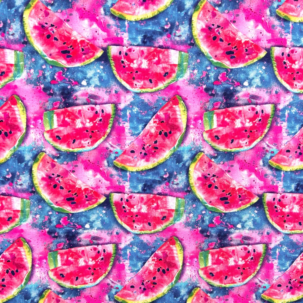 A digitally printed French Terry fabric featuring a watermelon design. French Terry, also known as loop back jersey has small loops/piles of yarn on the reverse side, giving it extra comfort and warmth. This fabric has 4 way stretch and would be suitable for sweatshirts, hoodies, pyjamas, tops, leggings and more!