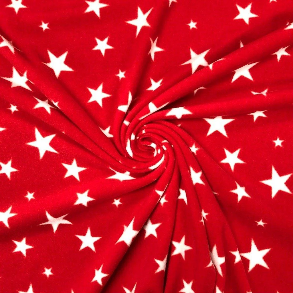 A high quality polar fleece fabric featuring white stars, available on different colour backgrounds. This fabric has a lovely feel on the skin as the fabric is very soft to touch. As this is an anti pill polar fleece, it prevents prevents bobbling.Â
