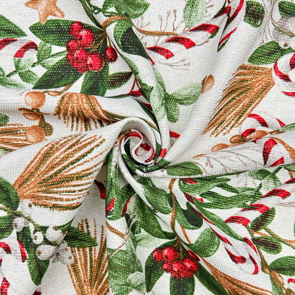 This lightweight, printed tapestry fabric featuring a Christmas themed print. Tapestry is a fine woven cloth, made by weaving coloured threads. The weave is built up to create a pattern and can often be reversible. Suitable for home soft furnishing such as curtains, upholstery and bedspreads, cushions and bean bags etc. It features gold lurex threads running through that add a wonderful touch of sparkle which add texture and vibrance to your home!