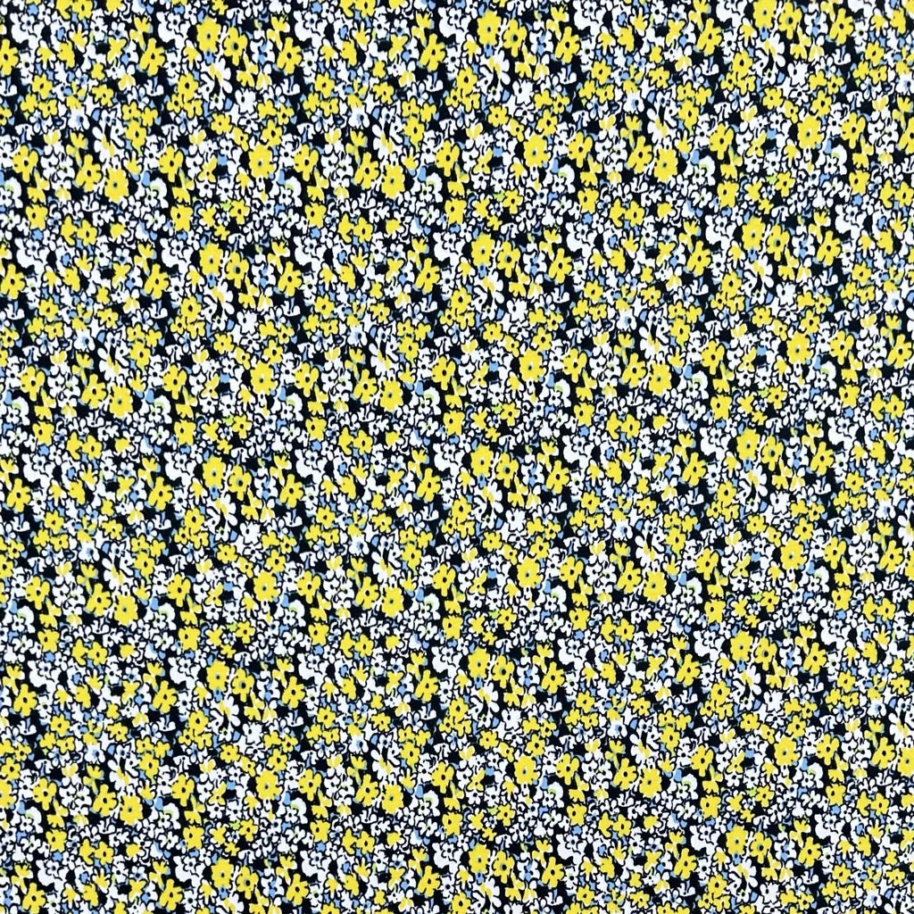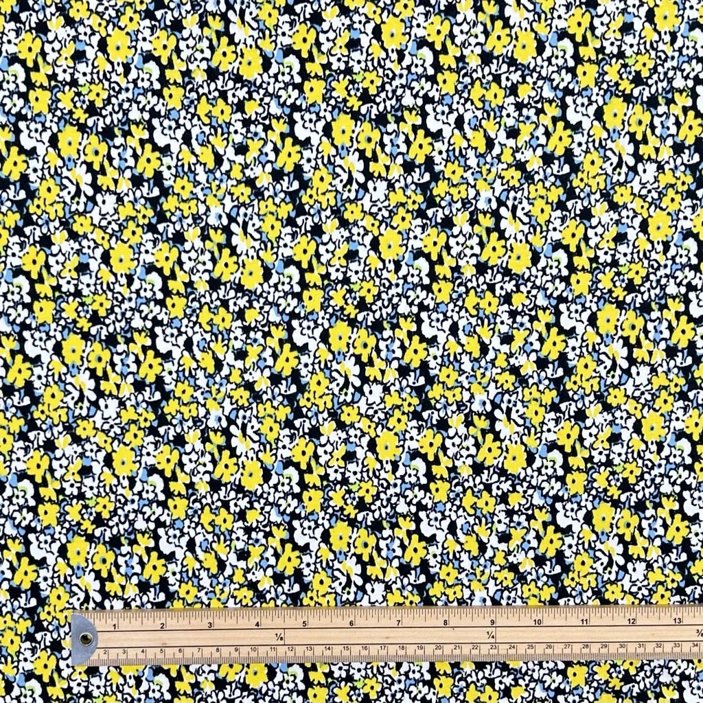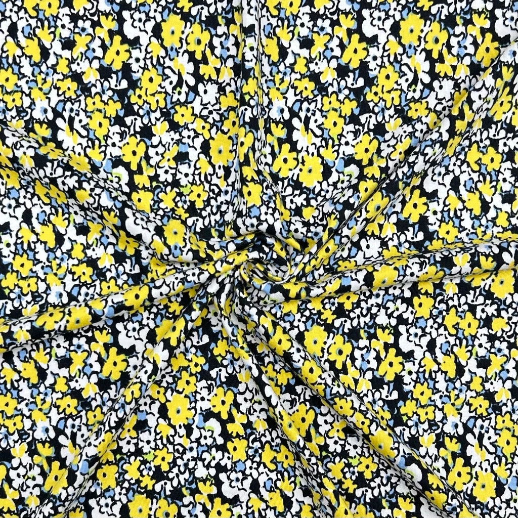 A high quality cotton lycra fabric featuring a yellow, blue and white flowers design on a black background. This fabric would be great for a range of dressmaking projects such as tops, dresses, skirts, pyjamas and more.