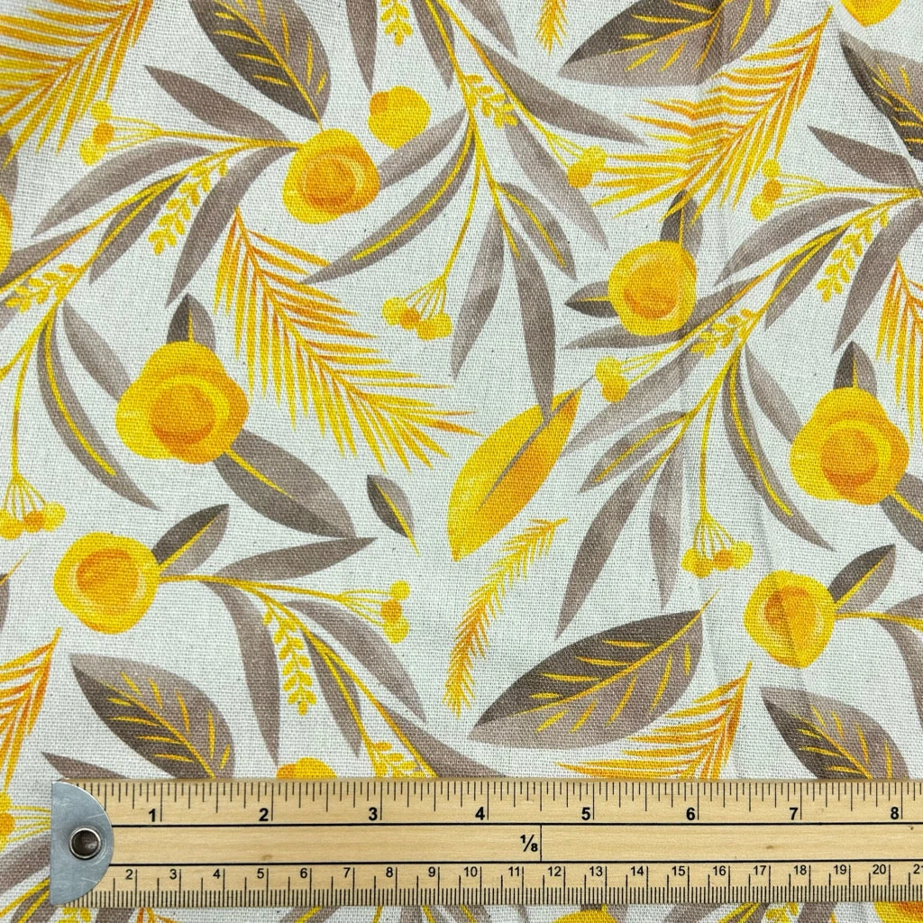 A viscose and linen blend fabric featuring an abstract, yellow flowers and grey leaves design on an ivory background. The breathability of linen paired with the beautiful drape of viscose makes this fabric perfect for summer clothing.
